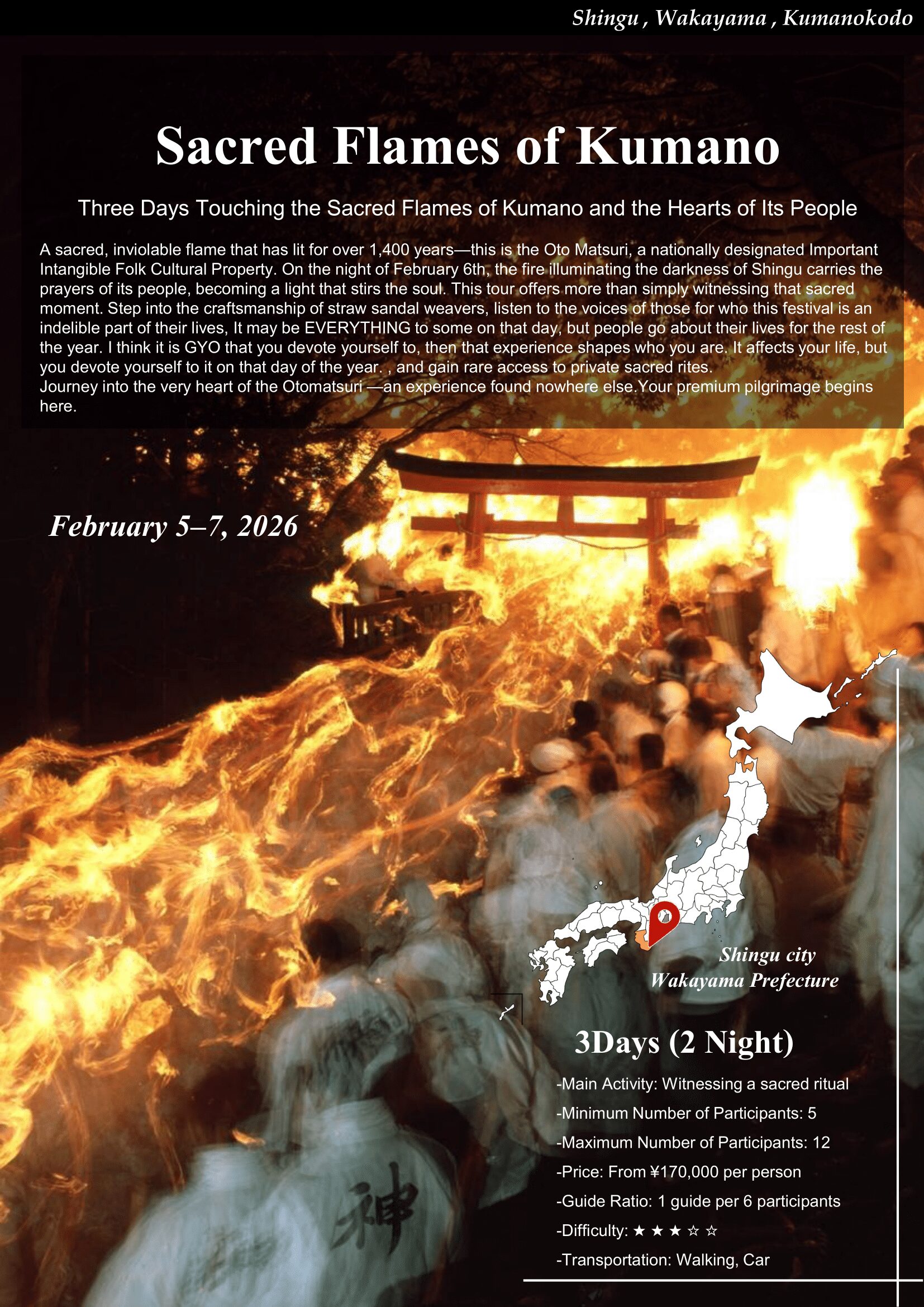- Special Observation of Oto Matsuri Rituals: Special viewing of the “Kagari Goku” dedication ritual performed at the World Heritage site Kumano Hayatama Grand Shrine.