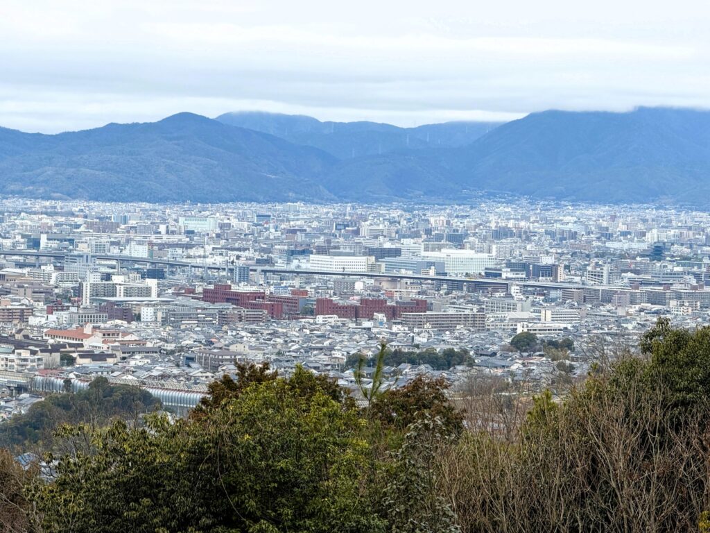 I continue uphill a short ways to a grassy overlook. South Kyoto has been called Japan’s Silicon Valley, and here it is all laid out below me, from the lone tower of Kyocera, to the twin cubes that are the Nintendo headquarters. Far in the distance, the jagged teeth of the Osaka skyline lines the gap where the hills fall away. The benches here make for a tempting picnic spot, but my lunch awaits a further hour away in town.