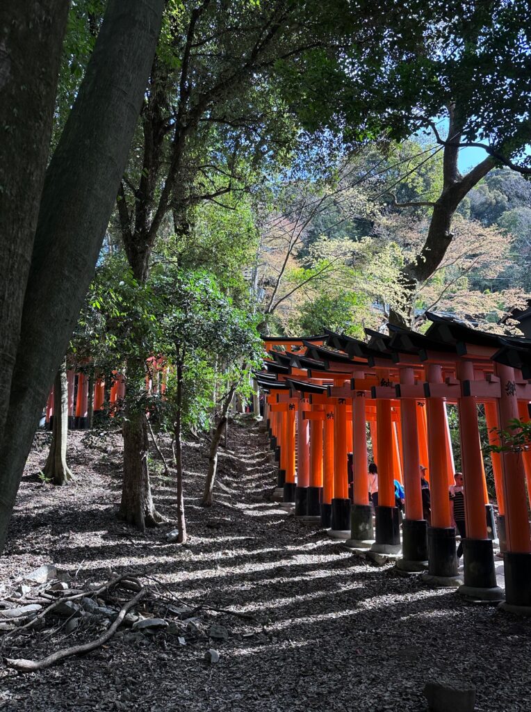 I decided to walk it in the opposite direction this time, in order to finish with lunch in Fushimi town. One has the option of starting from either of Fushimi Inari’s train stations, and I recommend turning left at the top of the steps beside the shrine’s Honden, in order to avoid the social media scrum shooting photos where the massive torii gates begin. Far better to take the quieter path that leads past Inari Saryo cafe, continuing to follow this main path as it weaves around toward Ippon-sugi. Where the row of torii crosses the path, turn right to enter them, moving against the flow of tourist traffic for about 20 meters until a path opens up on the left, with a post for the Kyoto Isshū Trail, marked 2-2.