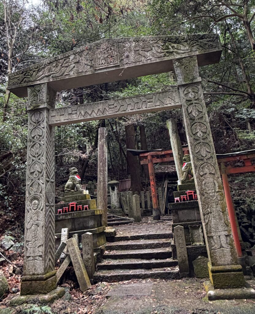 The torii gate at the base of the shrine is the most unusual I’ve seen in Japan. It has an ancient look, out of Egypt, of Greece, of Angkor, leading the walker to feel they’ve stumbled across timeless ruins. The shrine, like Fushimi Inari’s remoter shrine groves, hint at how wild prehistoric Shinto had once looked.