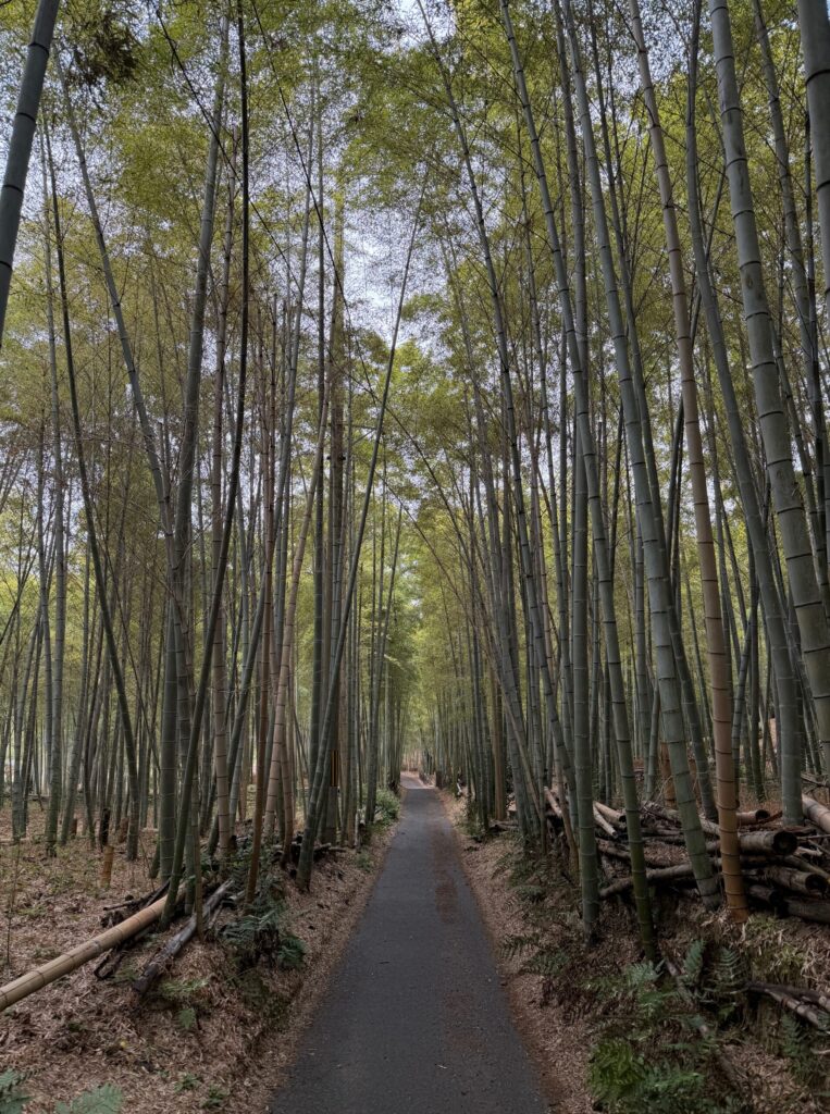 I instead turn right and stay with the Fushimi-Fukakusa course, curling around a beautiful old home before entering the lower reaches of the bamboo forest. The forest has ancient roots, the setting for Japan’s earliest prose narrative, The Tale of the Bamboo Cutter, written around the end of the 9th Century. I pass a woodsman and ask him about the numbers spray painted onto many of the trees, which he confirms are simply dates from the Reiwa calendar, indicating their time of planting. I had presumed that the terracing of these forests was due to carving away terrain clogged with the roots of old trees. But I’ve overthought it, as he says that the dirt there is simply dug away in order to cover up new plantings.