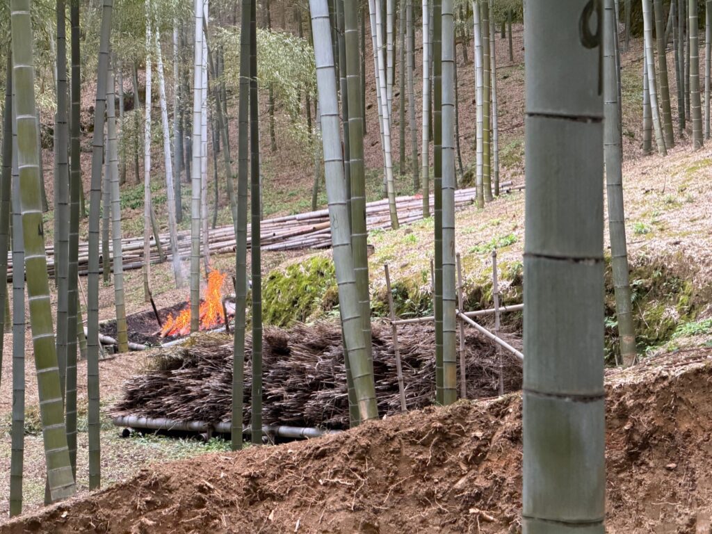 Today, a pair of workmen were busy cutting trees, burning off what they’d felled. Air bursts from within the bamboo’s sealed chambers echoed through the forest like gunfire.